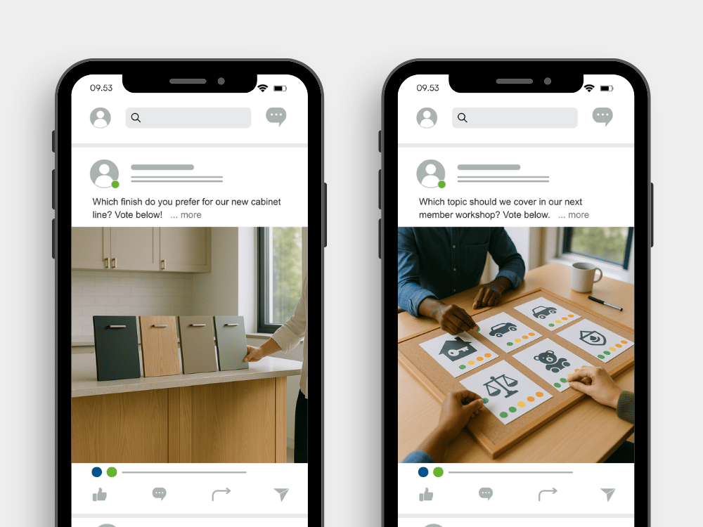 - “¿Qué acabado prefieres para nuestra nueva línea de muebles? ¡Vota aquí abajo!”